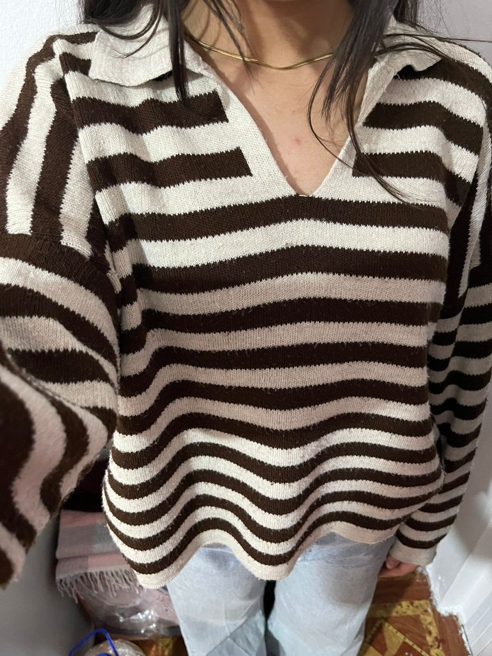 Uzun kollu, yakalı ve çizgili desene sahip, rahat kesim triko kadın kazak. Kahverengi ve gri renklerde, günlük sokak stiline uygun.