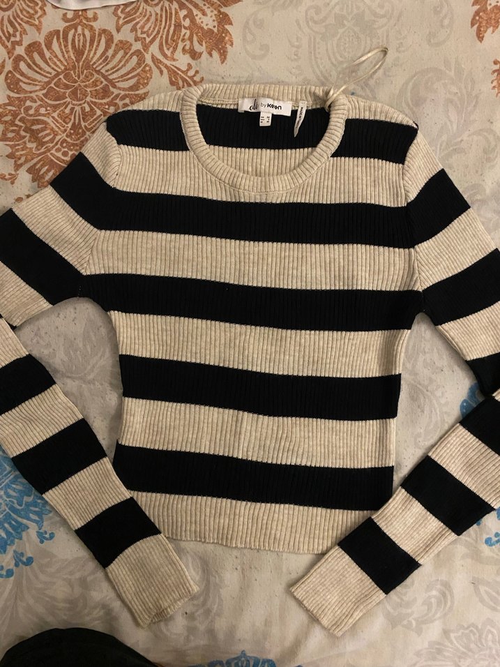 Yumuşak triko kumaştan, uzun kollu ve yuvarlak yakalı, çizgili ve dar kesim kadın kazak. Günlük kullanıma uygun rahat bir model.