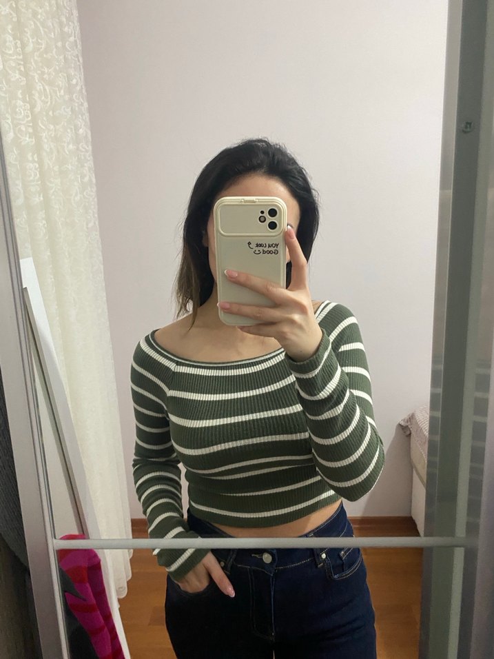 Fitted kesim, uzun kollu, kayık yaka kadın kazak. Çizgili, haki ve gri renklerde triko dokuma, gündelik normcore tarzda.