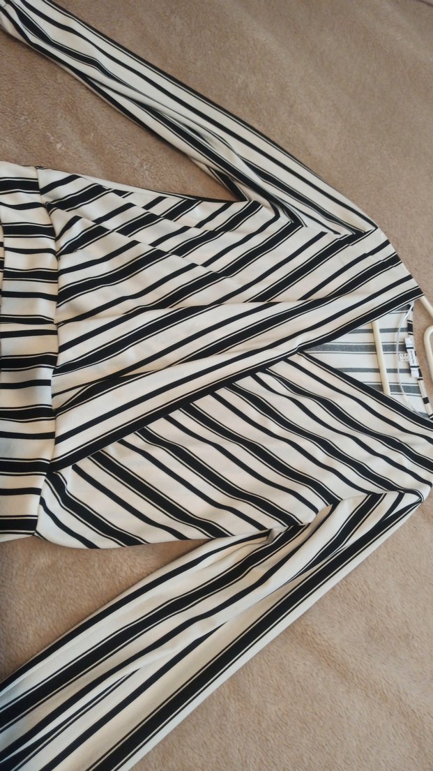 V yaka, pilili ve uzun kollu, beyaz ve gri çizgili, bol kesim sentetik kumaş gömlek. Trendy casual tarzda rahat bir seçenek.