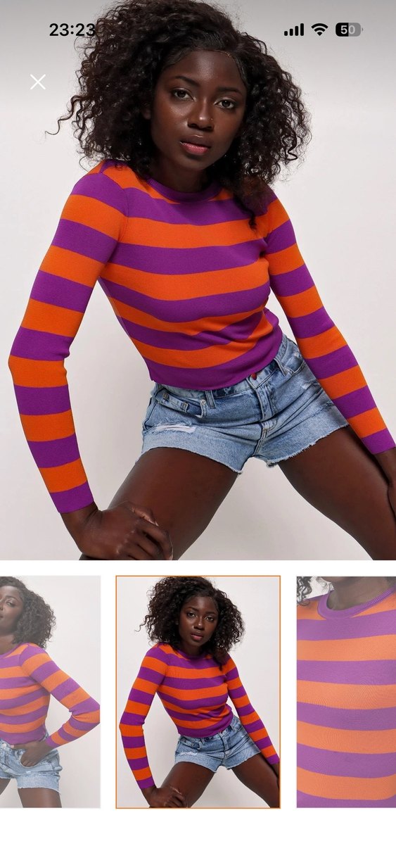 Vücuda oturan bu kadın kazağı uzun kollu ve kayık yaka detayına sahiptir. Canlı koyu renklerde çizgili deseni, örme sentetik kumaştan yapılmıştır. Normal midi boyda, trend ve rahat athleisure tarzını yansıtır.