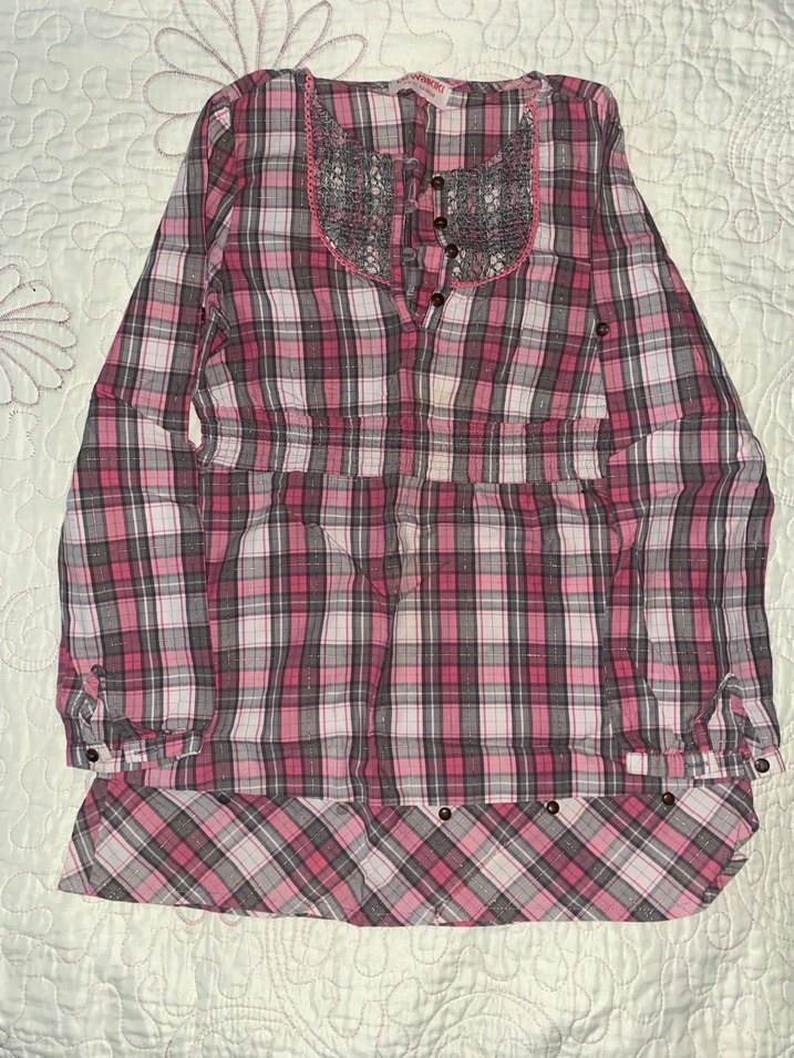 Pembe ve gri ekose desenli, düğmeli detaylı, uzun kollu, yakalı, bol kesim kadın gömleği. Yumuşak ve rahat kumaştan, günlük kullanıma uygun.