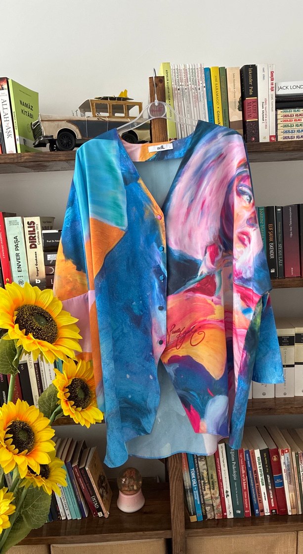 Uzun kollu, bol kesim ve dökümlü çok renkli baskılı gömlek. İpek gibi kumaştan, yakalı ve uzun boyda, günlük kullanıma uygun. Hiç kullanılmadı kimono çok kaliteli duruyor alan pişman olamayacaktır