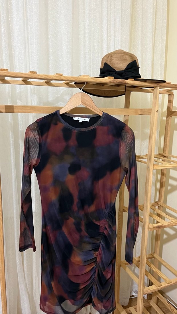 Bu dar kesim uzun elbise, koyu çok renkli batik deseni, bisiklet yaka uzun kollu ve drapeli 1 defa giydim sadece