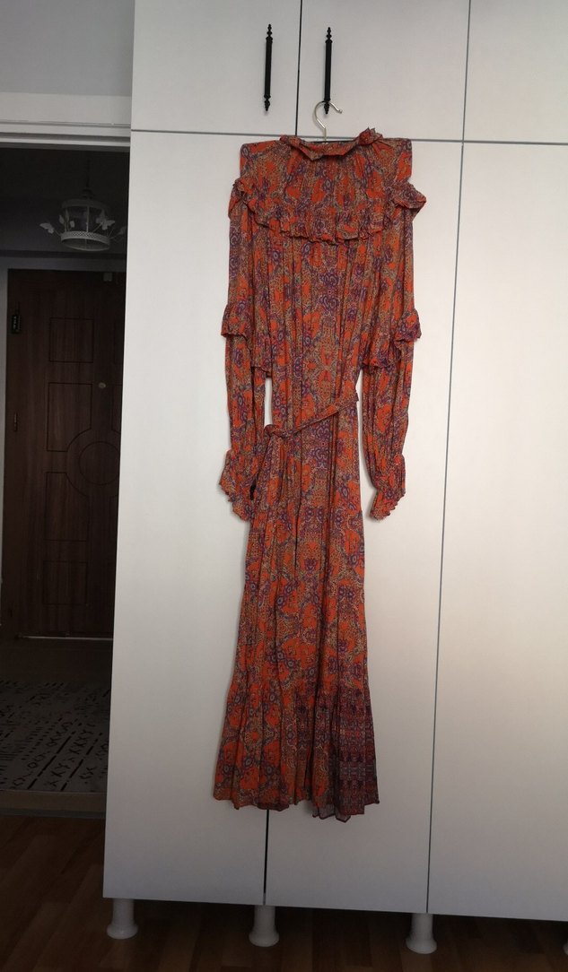 Uzun kollu, bol kesim bohem elbise yüksek yakalı ve fırfırlı detaylara sahip. Sentetik kumaştan yapılmış, koyu tonlarda çok renkli batik desenlidir, günlük kullanıma uygun.