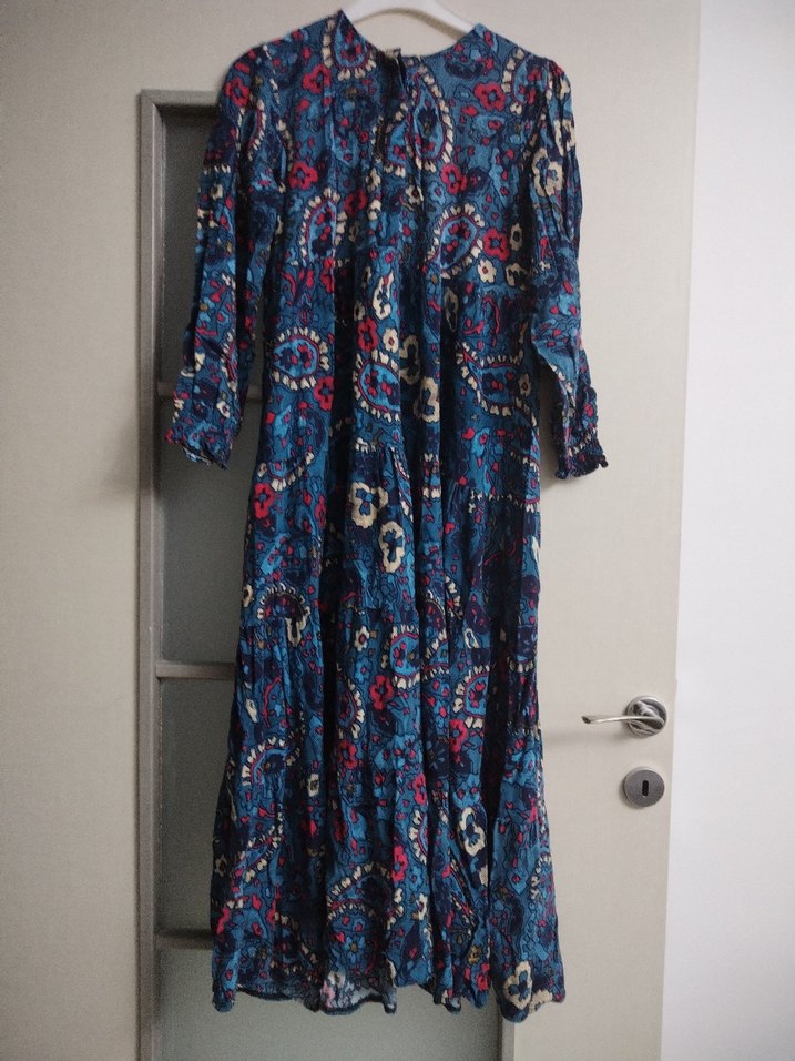 Uzun, bol kesim elbise koyu çok renkli batik desenli ve pile detaylıdır. Uzun kollu ve yuvarlak yakalı, bohem tarzını yansıtır.Geniş beden salaş model