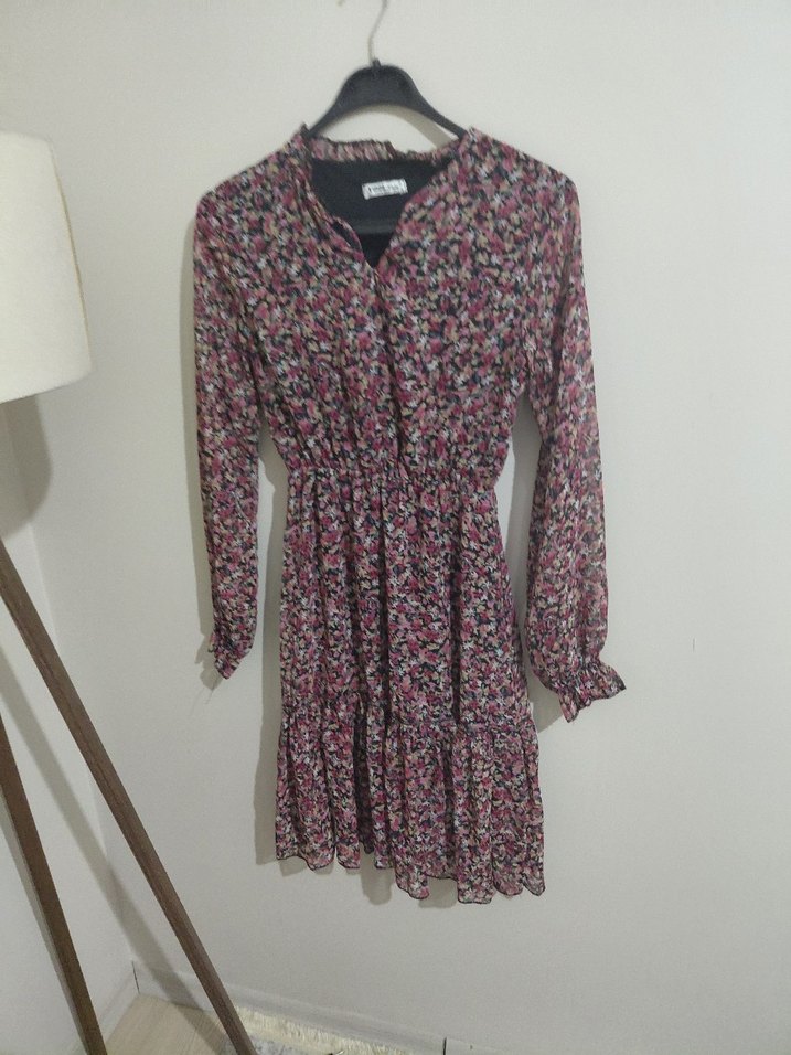Bol kesim mini elbise, V yaka ve uzun kollu, fırfır detaylıdır. Sentetik kumaş üzerinde çok renkli batik desen bulunur, günlük kullanım için uygundur.