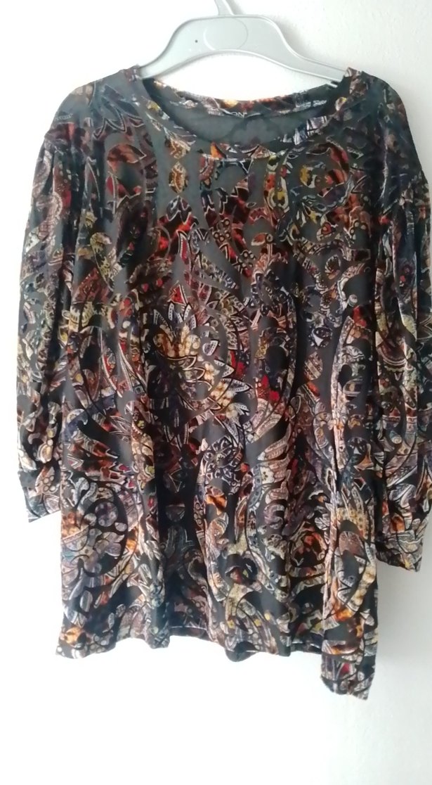 Bohem tarzda, çok renkli desenli, uzun kollu ve rahat kesim kadın bluzu. Yuvarlak yaka likrali bluz.