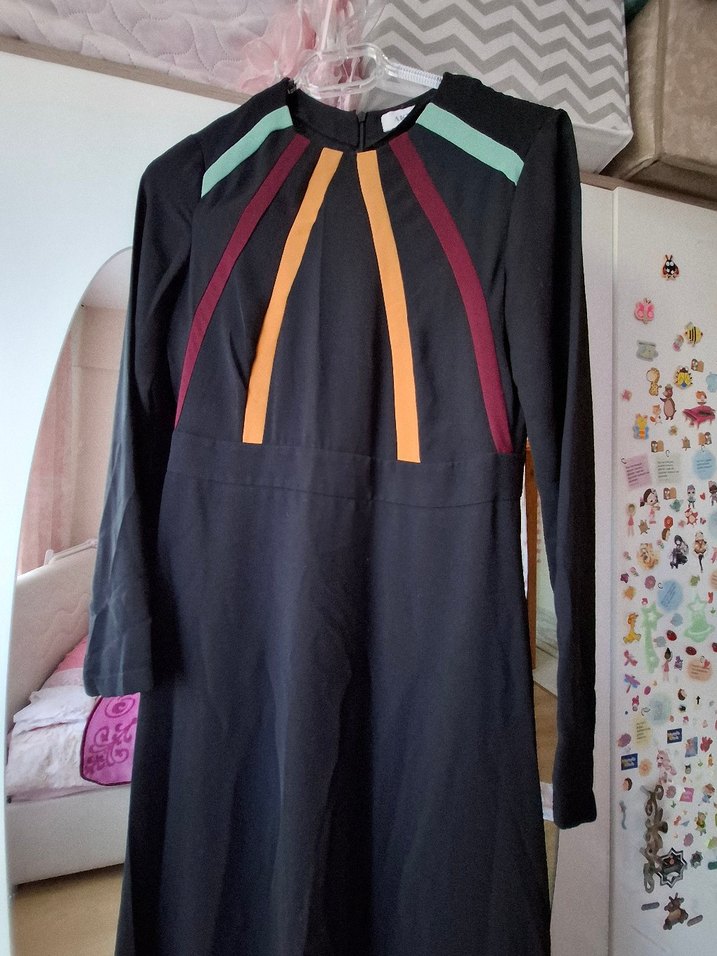 Uzun kollu, oturan kesim elbise, sentetik kumaştan, bisiklet yaka ve drapeli detaylara sahip. Koyu renkte, çok renkli baskılı, avant-garde ofis tarzına uygun. sadece iki defa giyildi hiçbir sorunu yok gloş kesim ve astarlidir