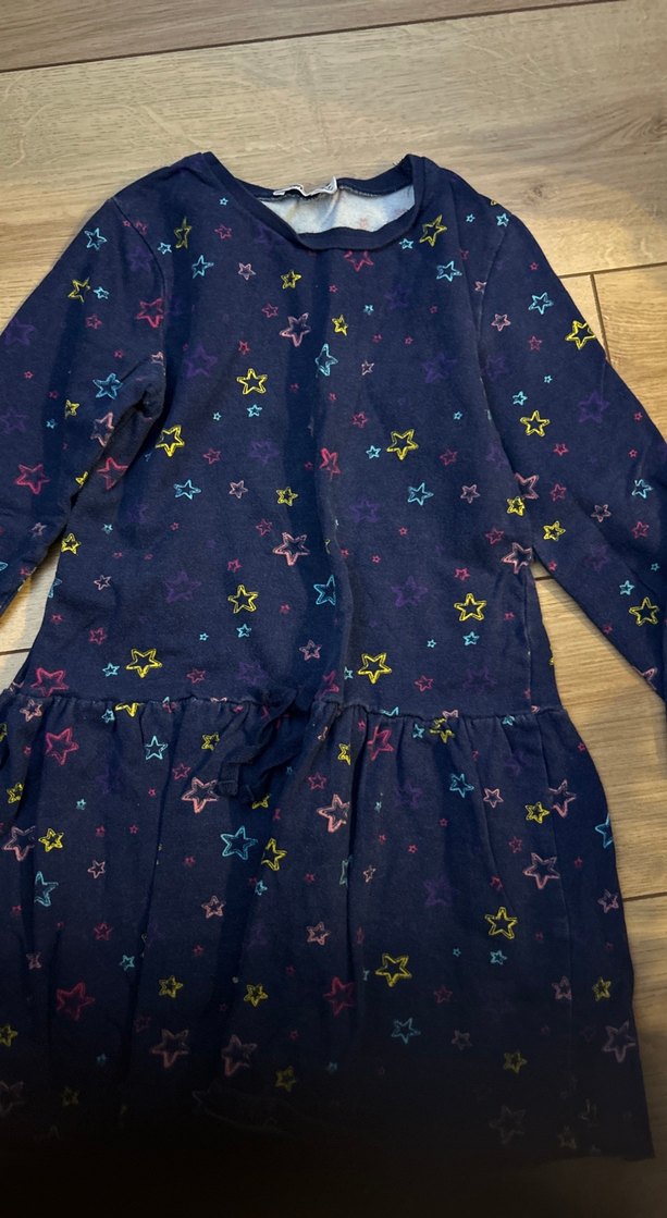 Sentetik kumaştan, uzun kollu, çok renkli yıldız desenli, bol kesim kız elbisesi. Belde fırfır detayları bulunur