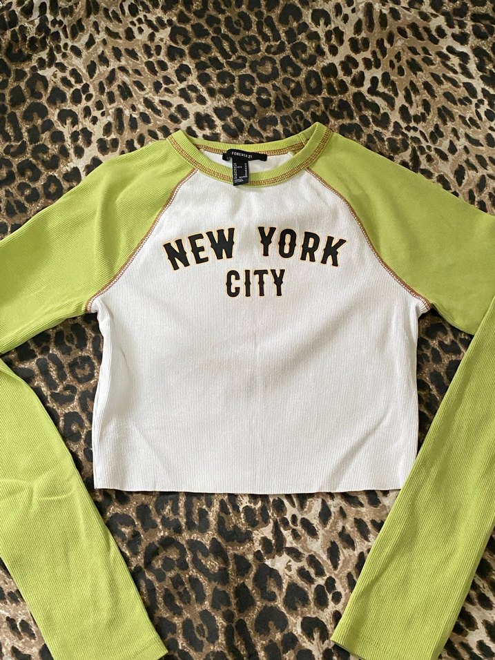 Pamuk kumaştan, uzun kollu ve bisiklet yakalı, yeşil tonlarında, baskılı ve kürk detaylı crop Üzerinde "NEW YORK CITY" yazısı bulunur. ️