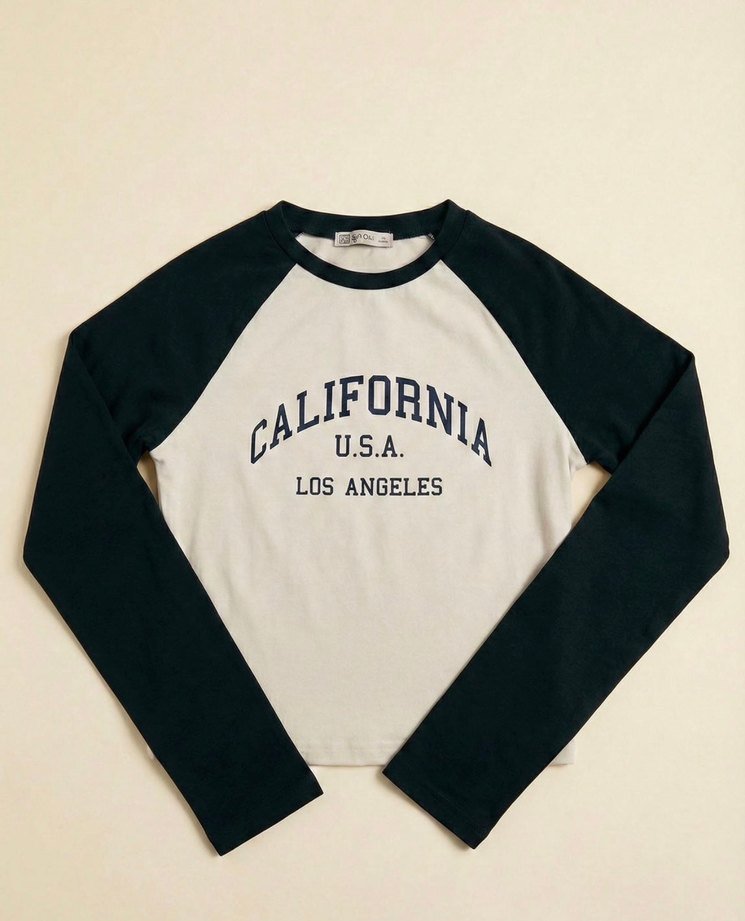 Pamuklu kumaştan, uzun kollu ve bisiklet yaka crop. 'California U.S.A. Los Angeles' baskılı, rahat kesim ve trend stil sunar. ️