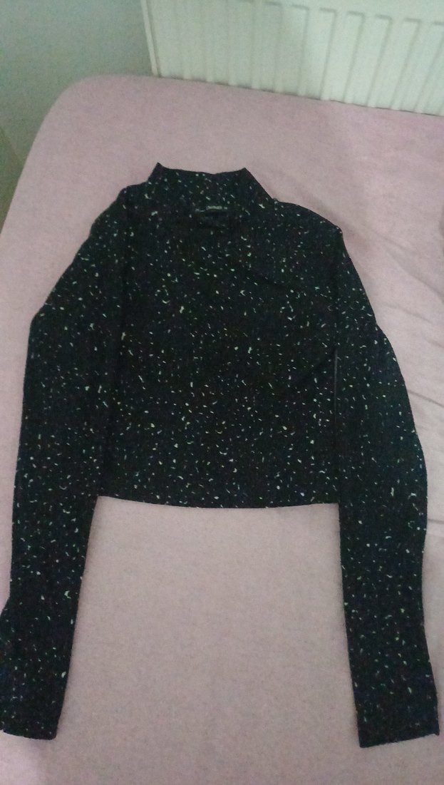 Yüksek yakalı M beden siyah üzeri beyaz desenlerle süslü crop bluz. kumaşı vücudu sarar ve sıcak tutar