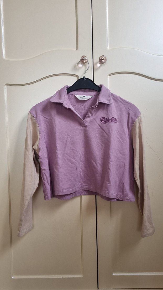 Satın almadan önce sorunuz. Uzun kollu, yakalı ve bol kesim pamuklu kız gömleği. Pastel mor ve bej renkte, baskılı ve düğmeli detaylara sahip.