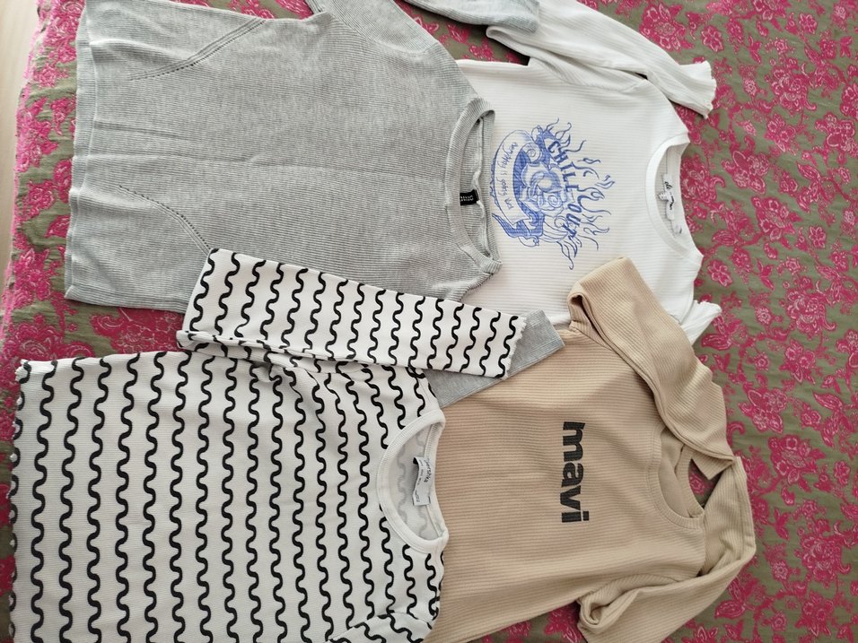 Uzun kollu, örgü dokulu gri , bisiklet yaka ve street wear tarzında. Üzerinde 'mavi' yazısı bulunur. beyaz gri krem ve sıyah cızgili aynı bedene uygun kısa crop. xs s beden uygun m de olabilir. sıyah oval çizgili olan sol kol altında sökük var ufak iplik söküğü dikime uygun fiyatlar uygun koydum başka sorun yoktur kullanımda. markaları üstündedir