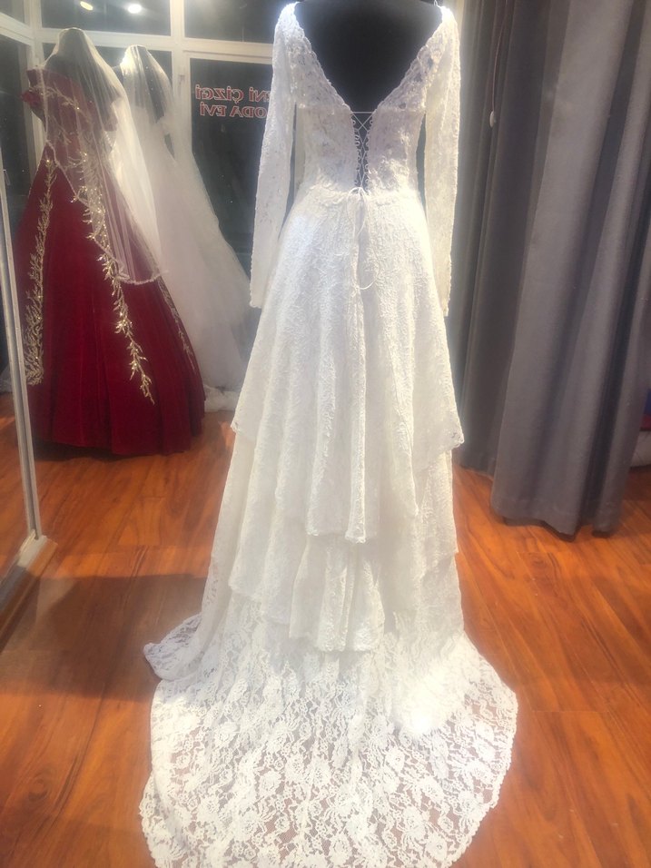 Uzun kollu, V yakalı, A kesim dantel gelinlik. Rahat kesimi ve vintage bohem tarzıyla klasik zarafeti yansıtıyor. Beyaz ve hafif gri tonlarda.