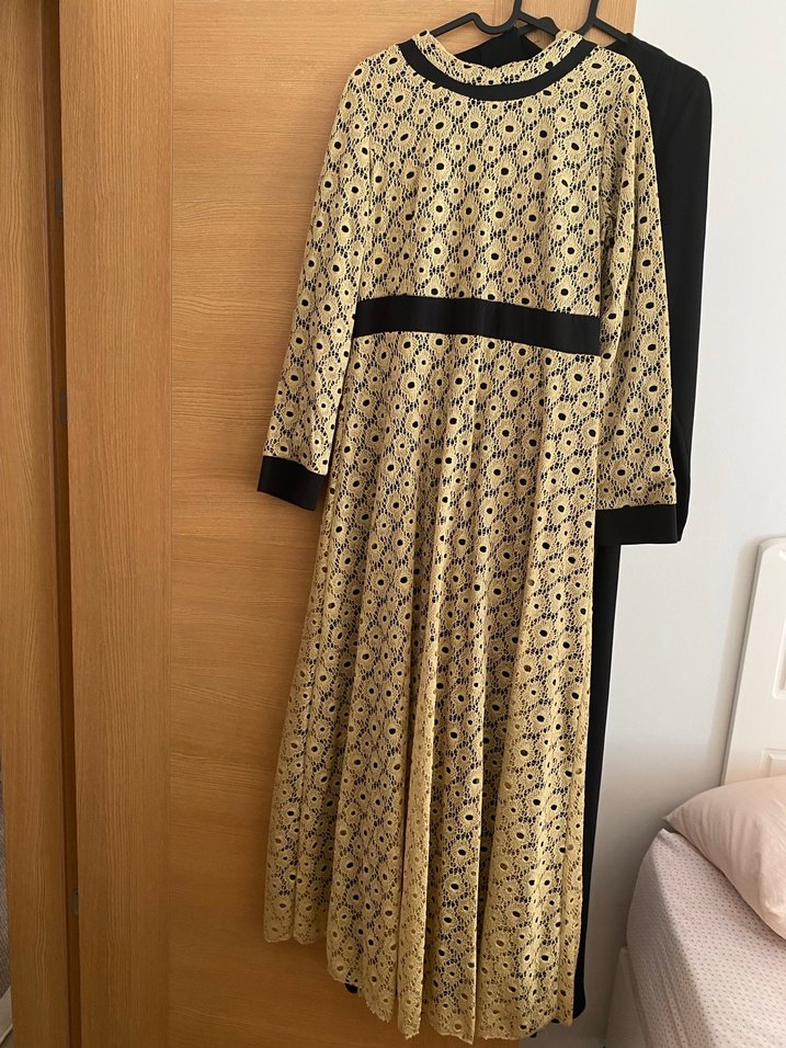 Yüksek yakalı, uzun kollu ve bol kesim olan bu uzun elbise, altın renginde dantel detayına sahip. Bel ve kollarında siyah detaylar bulunur. Bir kez giyilmiş olup temiz durumdadır .