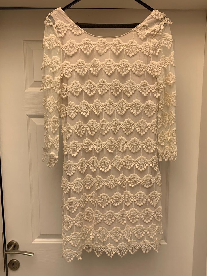 Bej renkli, uzun kollu ve tekne yakalı triko elbise. Nakışlı dantel detaylarıyla vintage bohem tarzı yansıtıyor, düğünler için uygun.