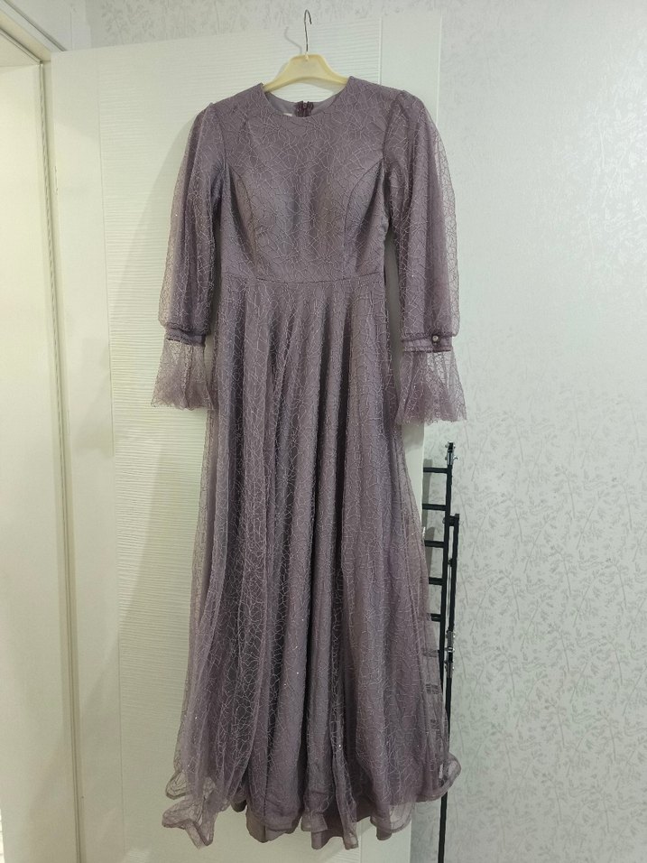 Uzun kollu, yuvarlak yakalı mor abiye elbise, dantel kumaştan ve bol kesimdir. Düğünler için modern klasik tarzdadır. ✨