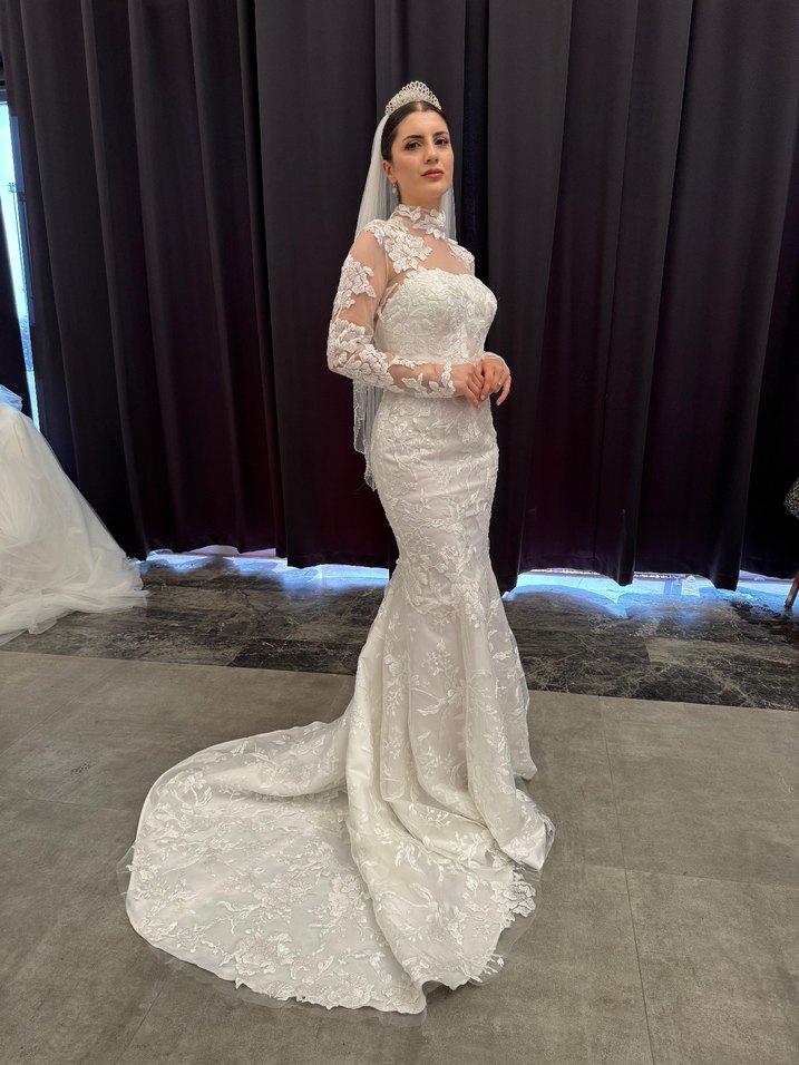 Uzun kollu dantel işlemeli, straplez yakalı ve sırtı transparan (isteğe bağlı tül kesilip tamamen ten görünümle giyilebilir) model gelinlik. Modern romantik tarzda beyaz renktedir. Model fotoğraflar çekilirken topuklu ayakkabı giymedi. Gelinlik bedeninin ölçüleri Bel:70 Kalça:96 dir. defilede bir kez giyildi. defilede giyildiği için uyguna satıyorum.