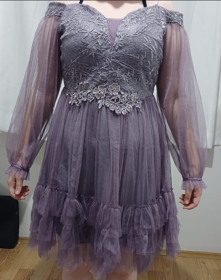lila renkli, uzun tüllü kollu, işlemeli dantel detaylara sahip, bol kesim midi elbise, gotik tarzda düğünler için uygun.