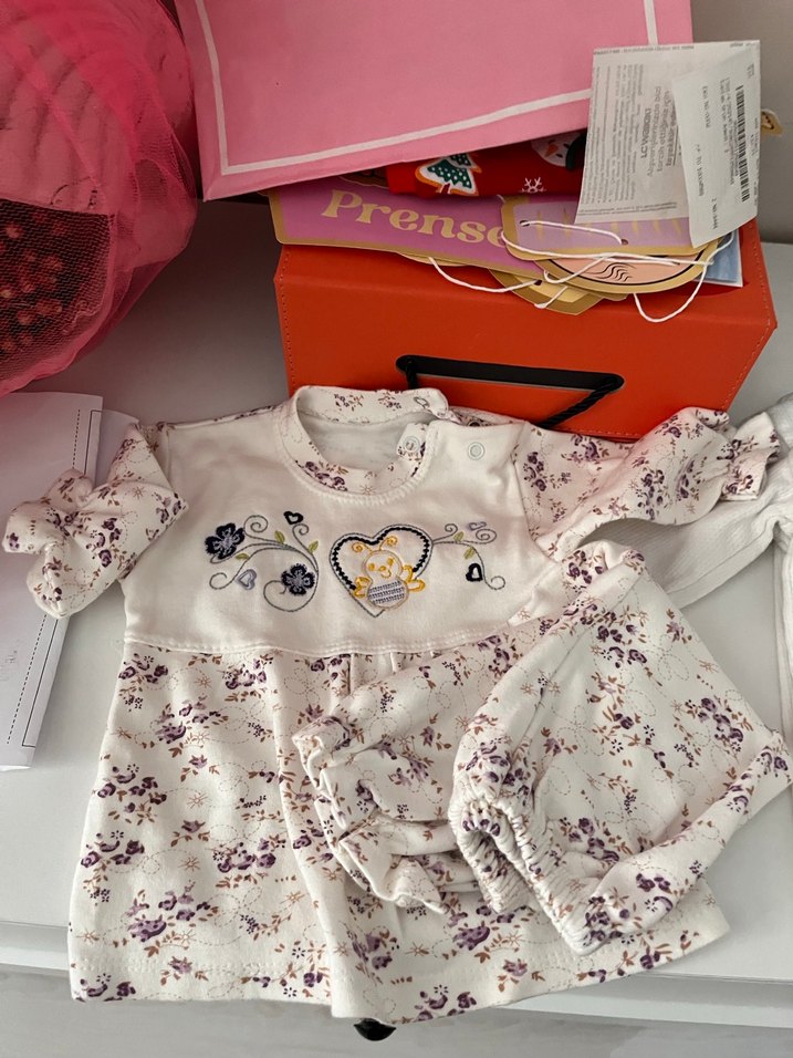Uzun kollu ve dantelli detaylara sahip, renkli çiçek desenli yumuşak kumaştan bebek kız takımı. Üst ve uyumlu pantolon içerir. İkili fiyat