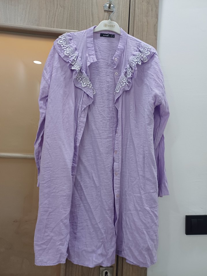 Lila pastel keten kumaştan, uzun ve bol kesim kadın gömlek. Yakada işlemeli dantel detayları bulunur, bohem tarzda günlük kullanıma uygundur.