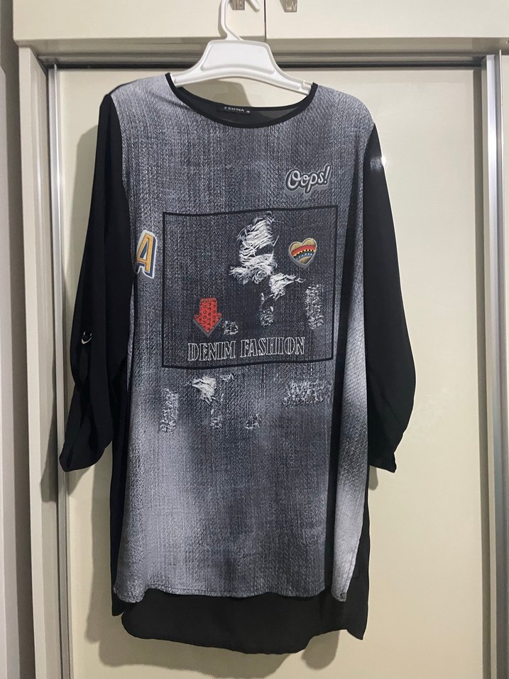 Gri ve siyah renklerde, baskılı desenli, düğmeli uzun kollu bol kesim denim tunik. Bisiklet yaka ve sokak tarzı özelliği taşır.