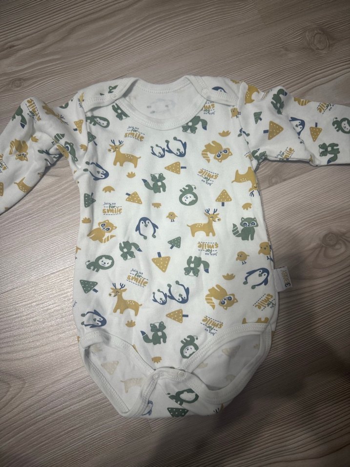 Hiç giyilmedi.Uzun kollu, yuvarlak yakalı bebek body, yumuşak sentetik kumaştan üretilmiş. Açık beyaz zemin üzerinde hayvan ve doğa desenleri bulunur, örme dokusu rahatlık sağlar.
