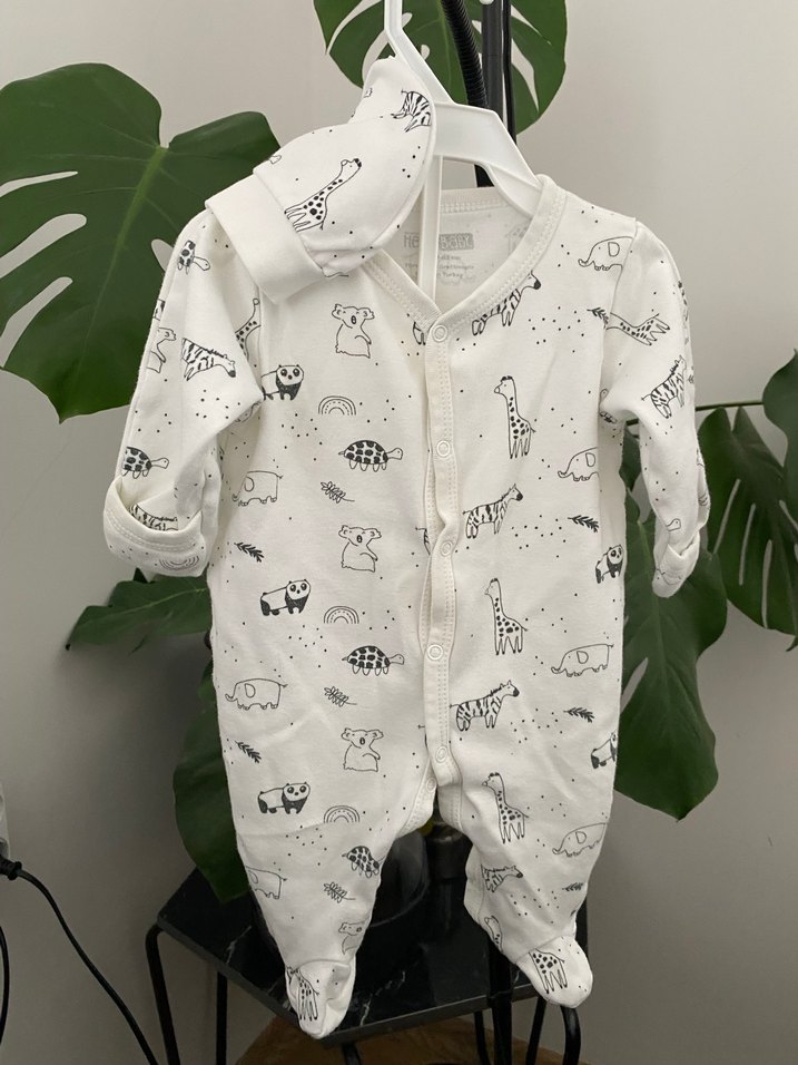 Uzun kollu, boğazlı beyaz bebek tulumu, yumuşak örgü kumaştan yapılmıştır ve gri hayvan desenleriyle sokak stiline uygundur.