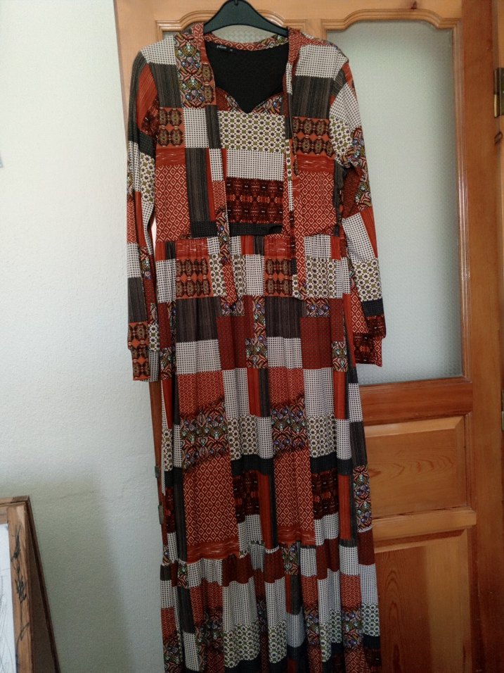 Uzun Kollu Desenli Bohem Kadın Elbise