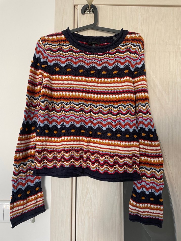 Bu örgü kadın kazak, bol kesim ve uzun kollu, koyu çok renkli desenli tasarıma sahiptir. Yuvarlak yaka ve günlük kullanıma uygun bohem tarzındadır.