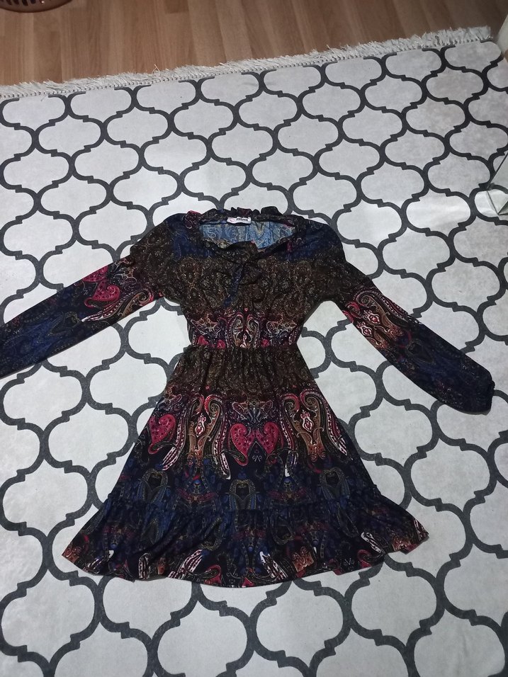 Uzun kollu, çok renkli desenli ve fırfırlı, sentetik kumaştan yapılmış, vücuda oturan mini elbise. Bohem tarz için uygun. hiç kullanılmadı.
