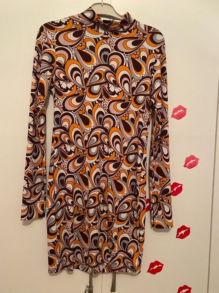 Uzun kollu, yüksek yakalı ve detaylı, koyu renkli, çok renkli retro desenli, vücuda oturan mini elbisedir. Romantik akşamlar için uygundur.