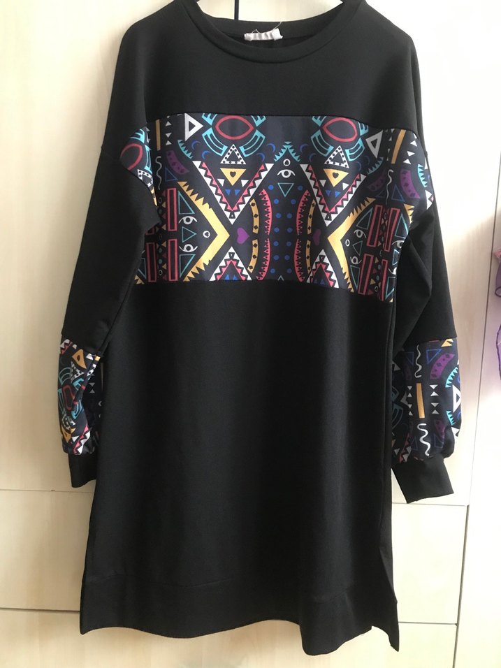 Uzun kollu ve bol kesim olan bu tunik, yuvarlak yakalı ve tekstil kumaştan yapılmıştır. Koyu renkli çok renkli desenlere ve boncuk detaylara sahiptir, bohem sokak stili yansıtır. Günlük kullanım için uygundur.