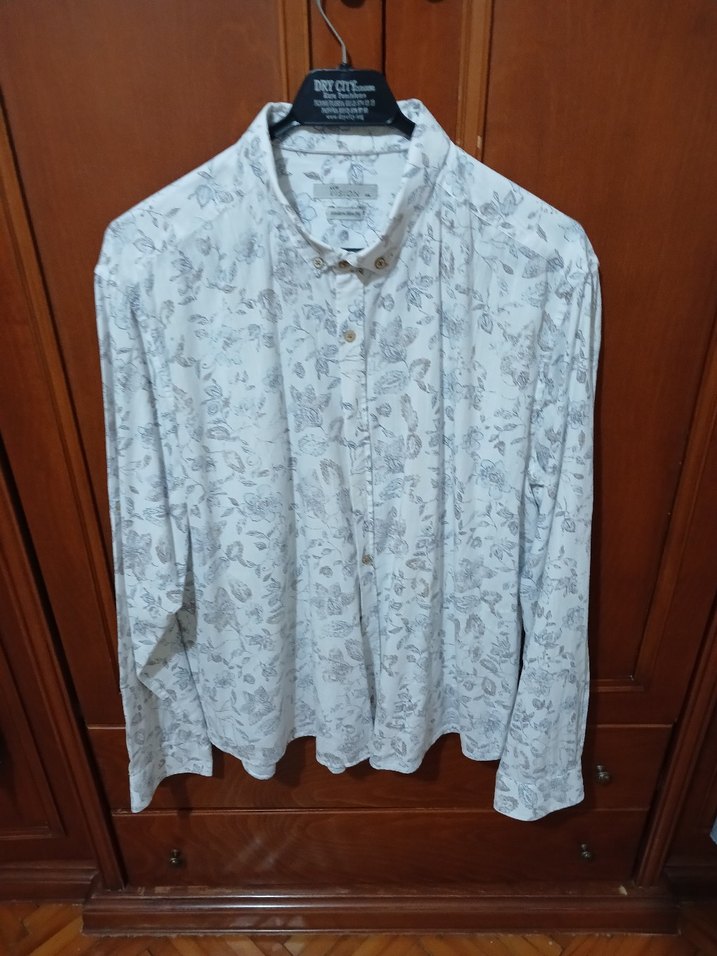 Uzun kollu, yakalı ve düğmeli ön kısmı olan erkek gömleği. Hafif keten kumaştan, bol kesim ve desenlidir. Beyaz zemin üzerine gri baskılar bulunur. 2 kol arası 67 cm,omuzdan boyu 69 cm ve kol 67 cm dir.Beyaz üzerine gri ve bej tonlarında desenler mevcuttur.