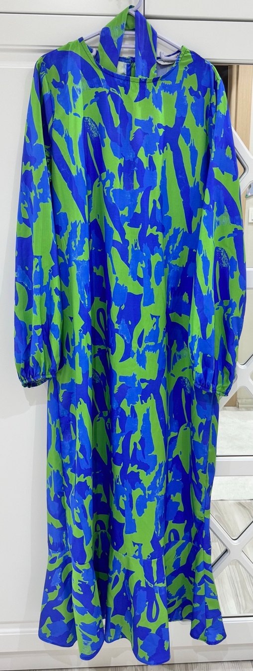 Uzun kollu, renkli mavi-yeşil, dökümlü ve rahat kesimli, günlük ve şık kullanıma uygun. Sayılı kullanıldı.