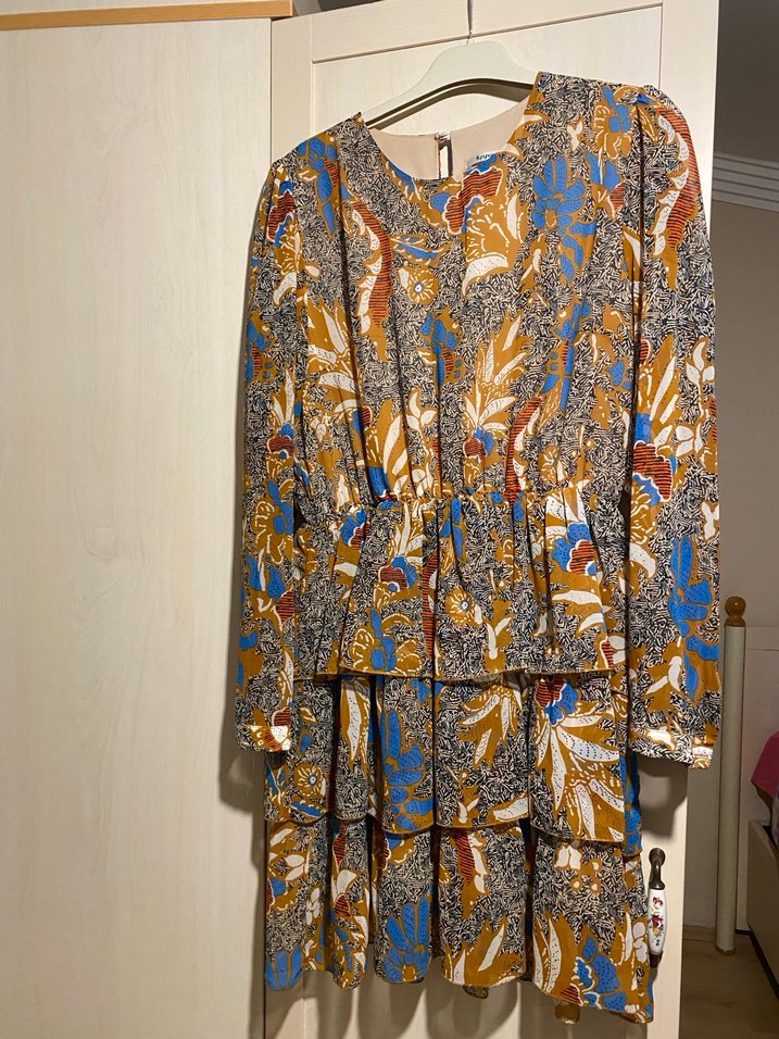 Kadın elbise belden oturmalı, uzun tül kolludur. Fırfır detaylı. efil efil kumaşı vardır. Deformesi yoktur. Ürün 2 kez giyilmiştir.