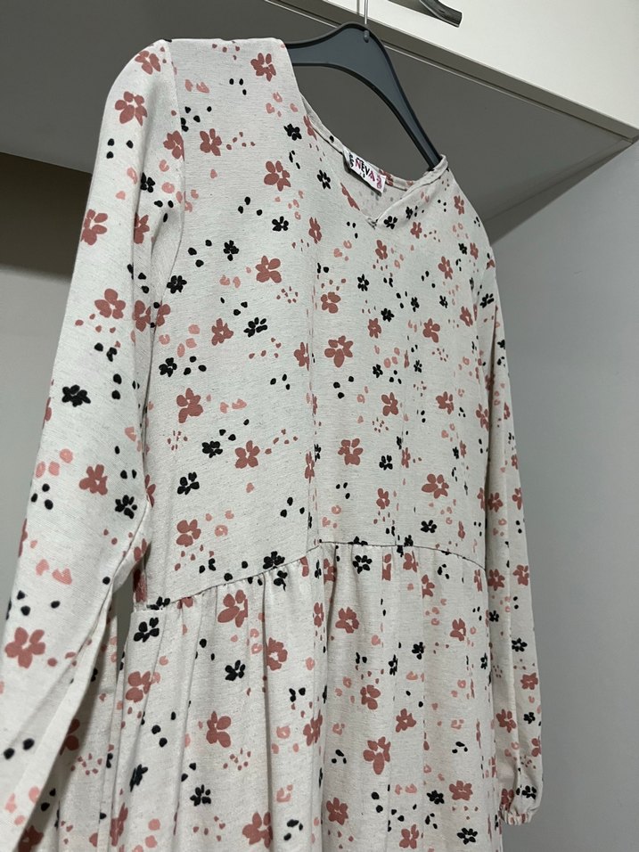 Uzun kollu, V yaka , bol kesim kadın elbisesi. Yumuşak sentetik kumaştan, beyaz zemin üzerinde siyah ve pembe çiçek desenlidir.