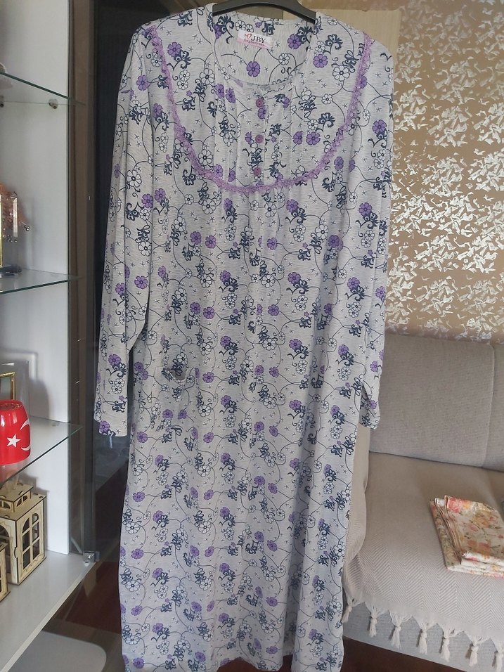 Kadınlar için uzun kollu, salaş kesim, bağlamalı desenli mor ve gri çiçekli uzun gece elbisesi. ölçüleri iki kol arası 72 uyu 128 santim hiç kullanılmamış büyük beden kilolular için ideal