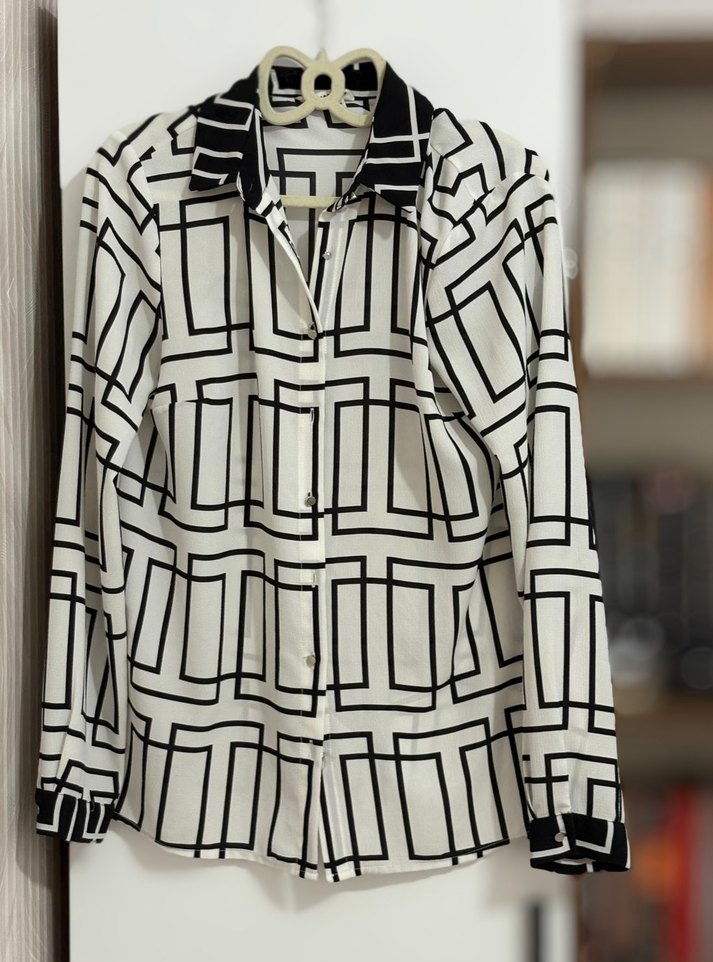 Uzun kollu, yakalı ve düğmeli kadın gömleği. Beyaz ve gri geometrik desenli, rahat kesim ve sentetik kumaştan üretilmiştir. Trendy ve ofis kullanımı için uygundur.