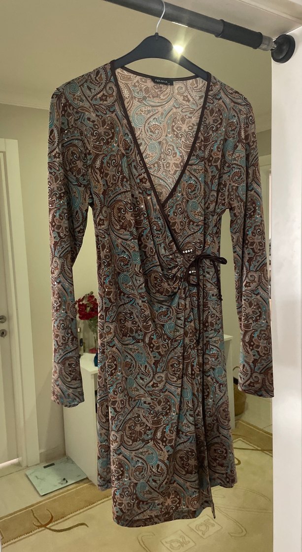 Uzun kollu, V yakalı, kahverengi desenli, beli bağcıklı, uzun boy bluz.