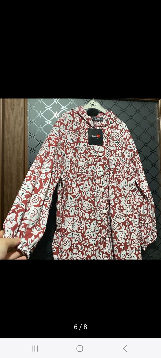 Uzun kollu, bol kesim elbise, yüksek yakalı ve düğmeli ön detaylı, sentetik kumaştan yapılmış koyu kırmızı çiçek desenlidir.