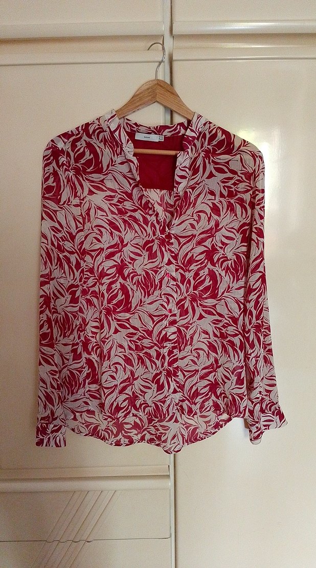 Uzun kollu, kırmızı ve gri desenli, hakim yakalı kadın gömleği. şifon gibi kumaştan, düğmeli ve bol kesimdir. Günlük kullanıma uygun bohem tarzda.