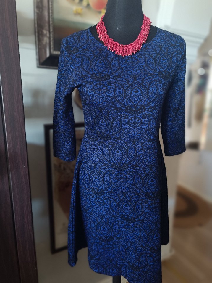Koyu mavi desenli, uzun kollu, vücuda oturan bu elbise, yuvarlak yaka ve boncuk işlemeleriyle klasik şıklığı ofis ortamına taşır. iki koltuk arası genişliği 45 santim uzunluğu 86 santimdir.