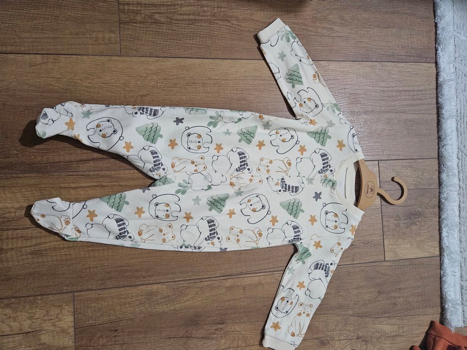 Ekru renkli, ayı ve ağaç desenli renkli baskılı bebek tulumu. Uzun kollu, yuvarlak yakalı ve yumuşak, sıcak örme kumaştan yapılmıştır.