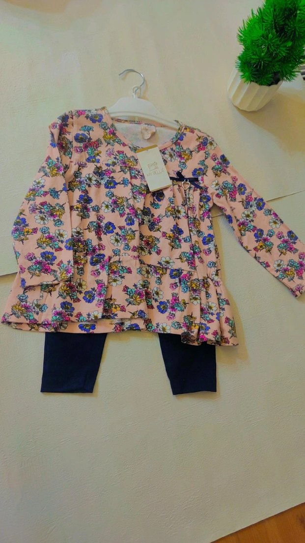 Uzun kollu, pastel pembe çiçek desenli ve düğmeli üst ile koyu renk taytlı bebek kız kıyafet takımı.