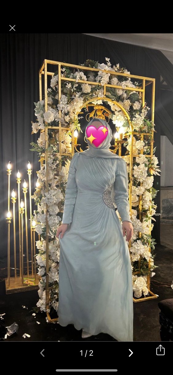 Bu dar kesim gri abiye elbise, yüksek yakalı ve uzun kollu, drapeli tasarım ve etnik desenle mütevazı düğünler için uygun.