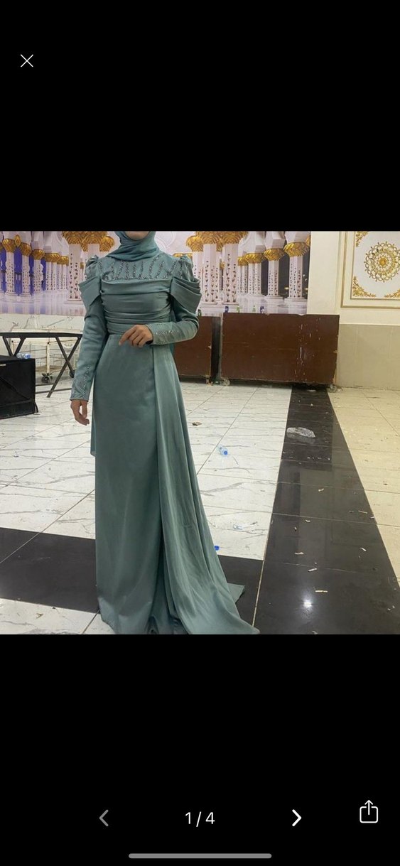 Turkuaz renkte, uzun kollu ve yüksek yakalı, modest tarzda drapeli uzun abiye elbisedir. Düz ve regular fit kesime sahiptir, düğünler için uygundur. ŞAL DAHİL