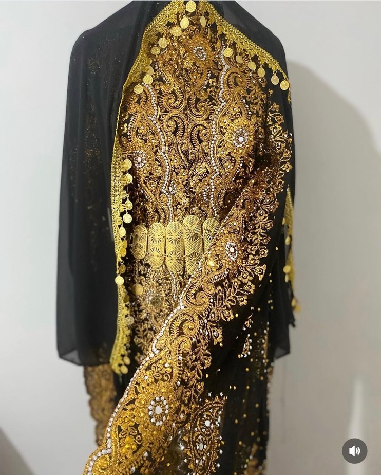 Uzun, straplez kesimli bu Hint elbisesi drapeli yapısı, detaylı altın desenleri ve bol kesimiyle dikkat çekiyor. Uzun kollu ve süslü kemerli, şık düğünler için uygun. ✨